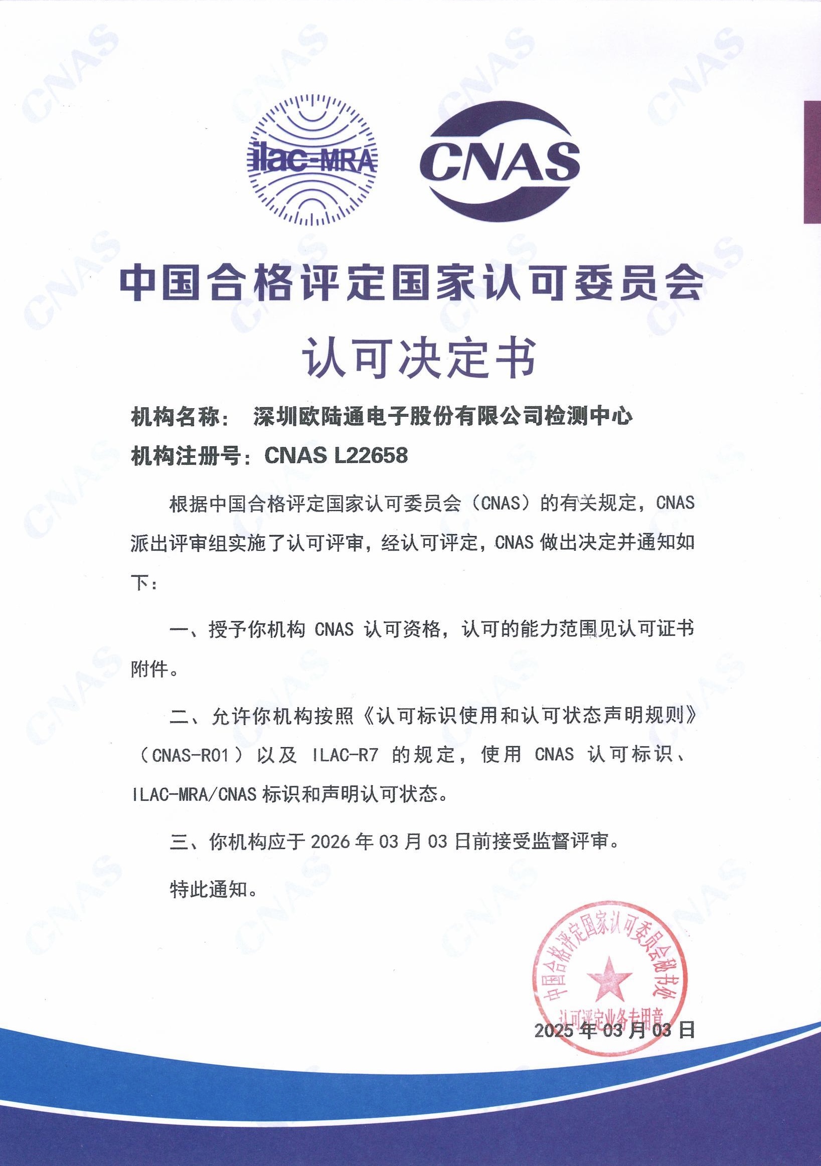 近日,歐陸通實(shí)驗(yàn)室順利通過(guò)了中國(guó)合格評(píng)定國(guó)家認(rèn)可委員會(huì)(CNAS)資質(zhì)評(píng)審及合格評(píng)定,榮獲國(guó)家級(jí)CNAS實(shí)驗(yàn)室認(rèn)可證書(shū),標(biāo)志著公司實(shí)驗(yàn)室的測(cè)試能力與管理體系已達(dá)到國(guó)際互認(rèn)水平,檢測(cè)報(bào)告和結(jié)果可實(shí)現(xiàn)在全球上百個(gè)國(guó)家和地區(qū)的互信認(rèn)可。